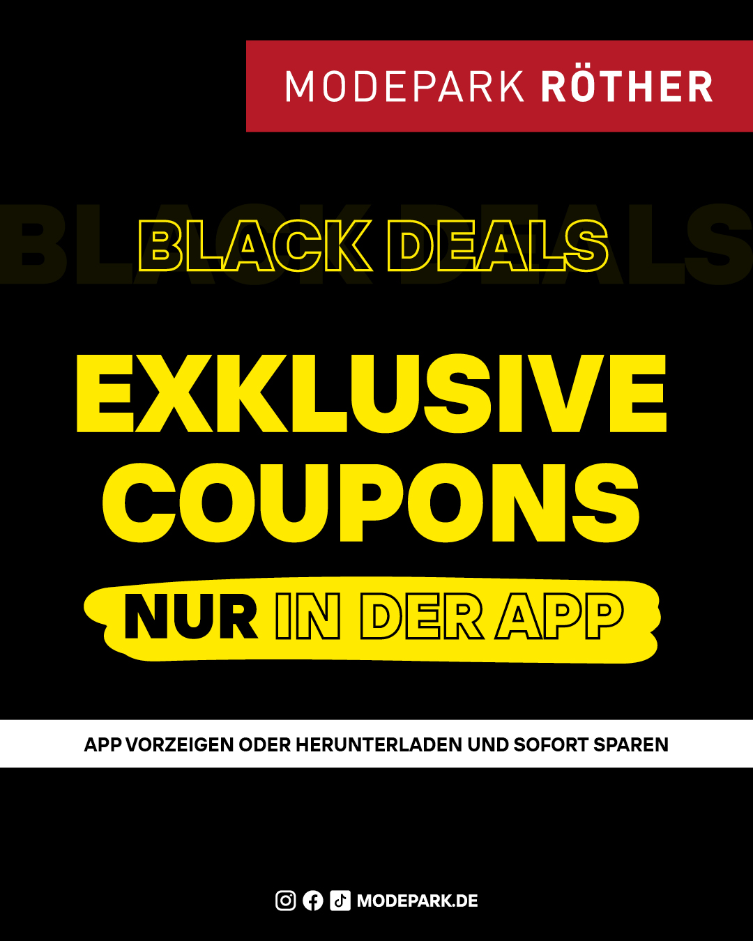 Die Black Deals bei MODEPARK RÖTHER sind da. In der App warten exklusive 20% Coupons auf dich – und ab Donnerstag, 27. November sogar 25% Extra-Coupons! Einfach Modepark Röther App vorzeigen oder herunterladen und sofort sparen. Gültig bis SA 29. November 2025.